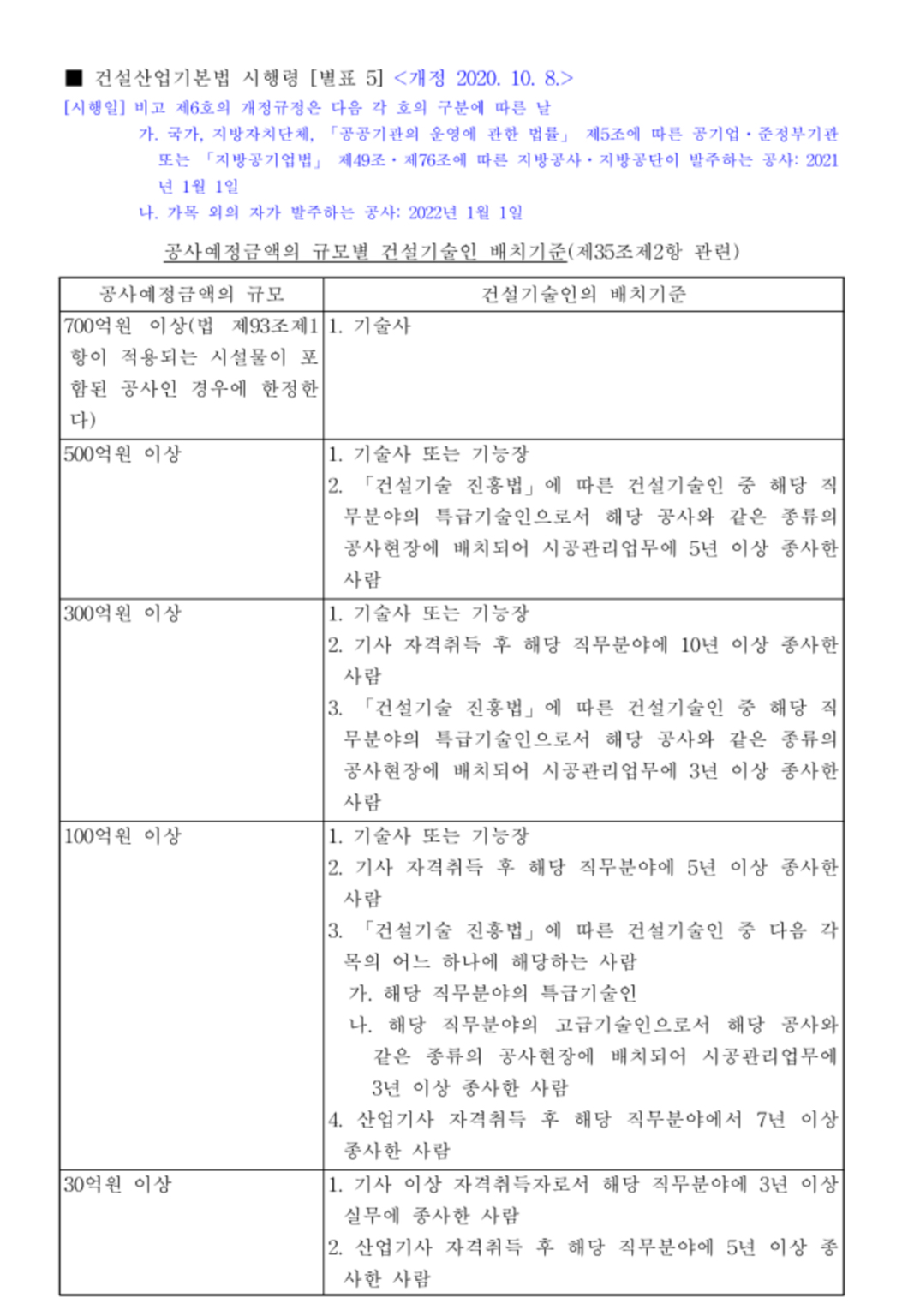 [별표 5] 공사예정금액의 규모별 건설기술인 배치기준(제35조제2항 관련)(건설산업기본법 시행령).pdf